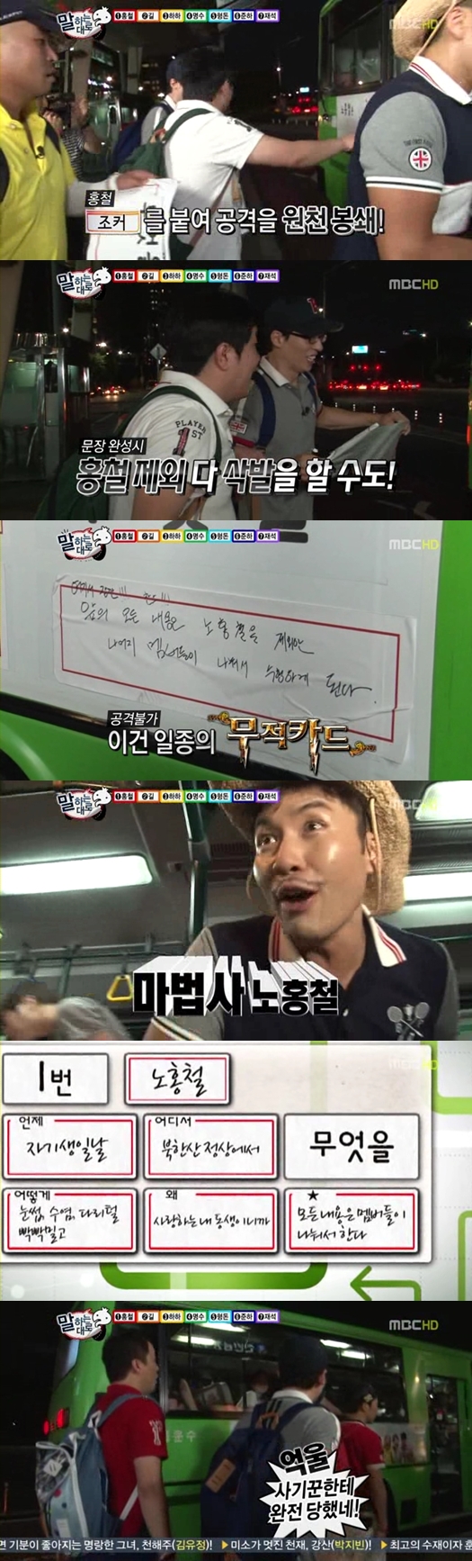 ノ・ホンチョルバスにはもう ‘自分の誕生日’, ‘ブッカン山頂上で’, ‘眉毛ひげ足毛くりくりに押して’, ‘愛する弟(妹)だから’が完成された状況だった. ‘何を’ 部分だけ完成されればノ・ホンチョルは坊主頭をしなければならない危機に処したが..ノ・ホンチョルジョーカーカードに “ノ・ホンチョル除いた無限挑戦メンバーたちが前の内容を遂行する”と書くせいで無限挑戦ダルンメムボドルが悔しくあう姿が電波に乗ったんです‾